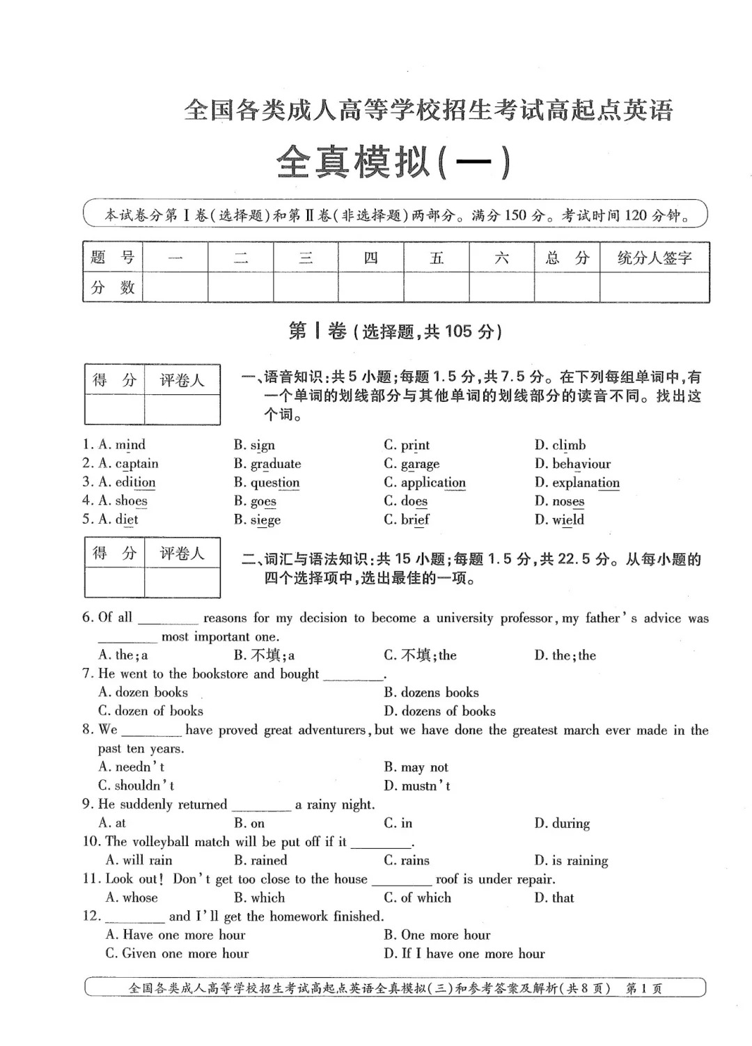 • 2024年浙江成人高考专科《英语》全真模拟卷(一)
