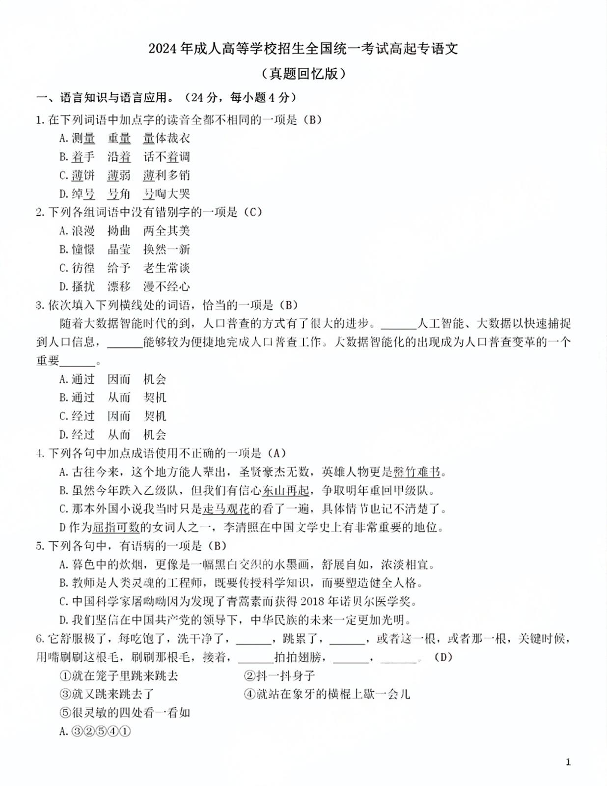 • 2024年成人高考全国统一考生(高起点语文)真题答案