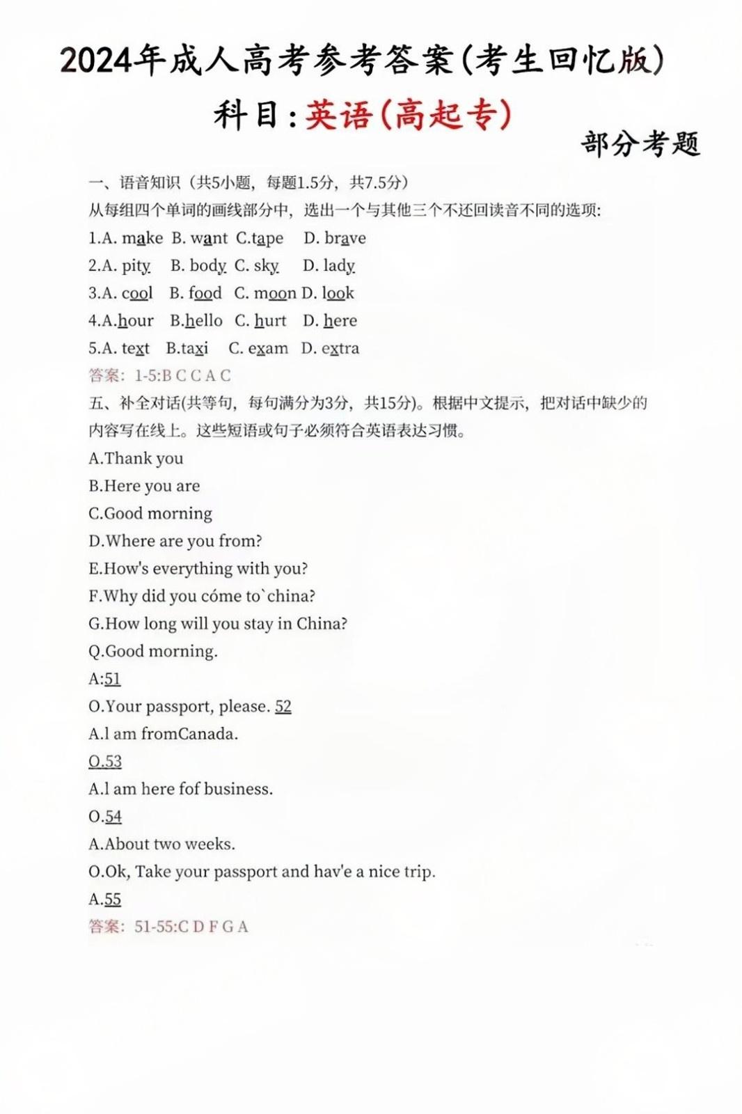 • 2024年成人高考全国统一考生(高起点英语)真题答案