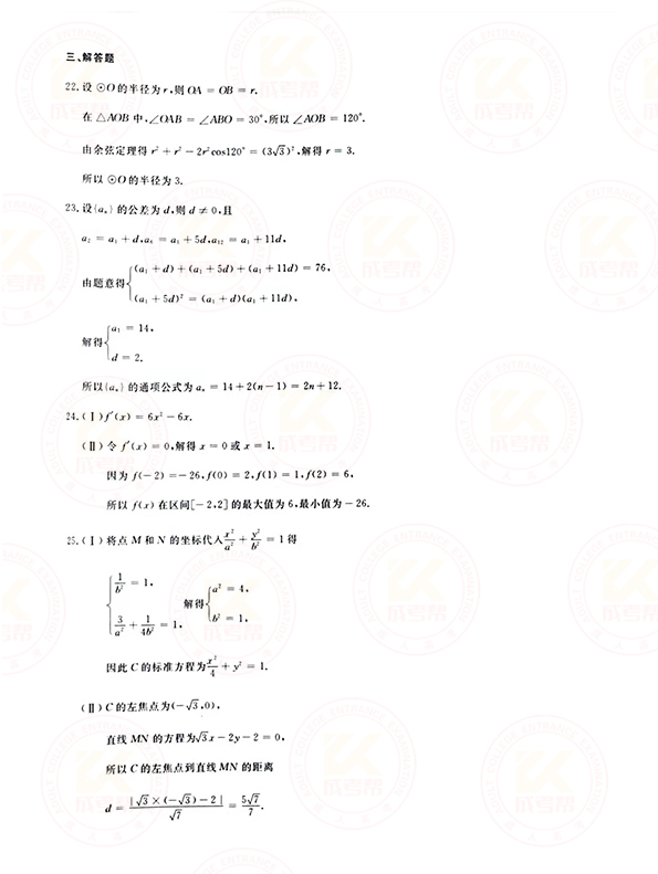 2019年成人高考高起点文数学历年真题及答案